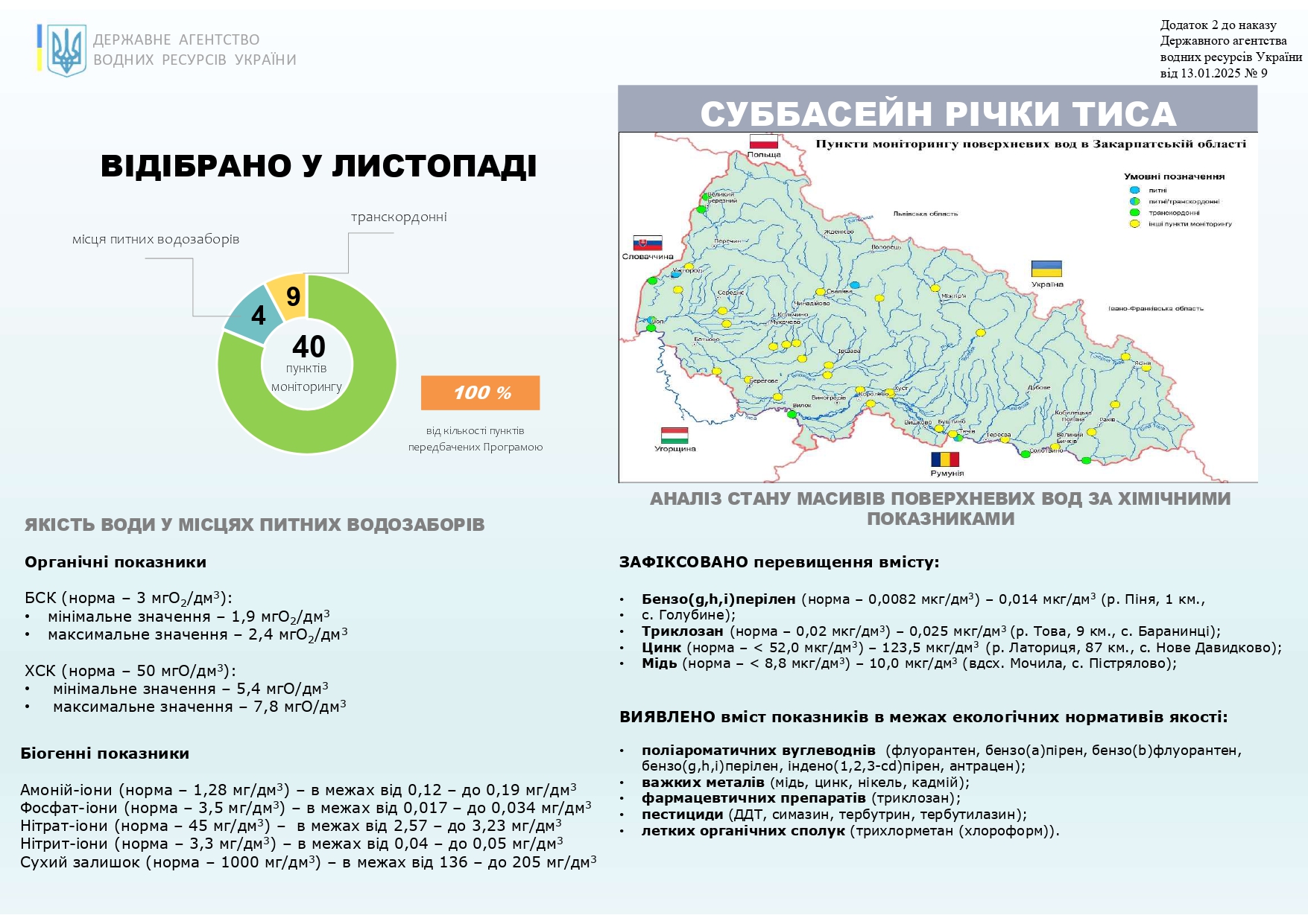Аналітичний огляд якісного стану масивів поверхневих вод суббасейну річки Тиса за листопад 2025 року