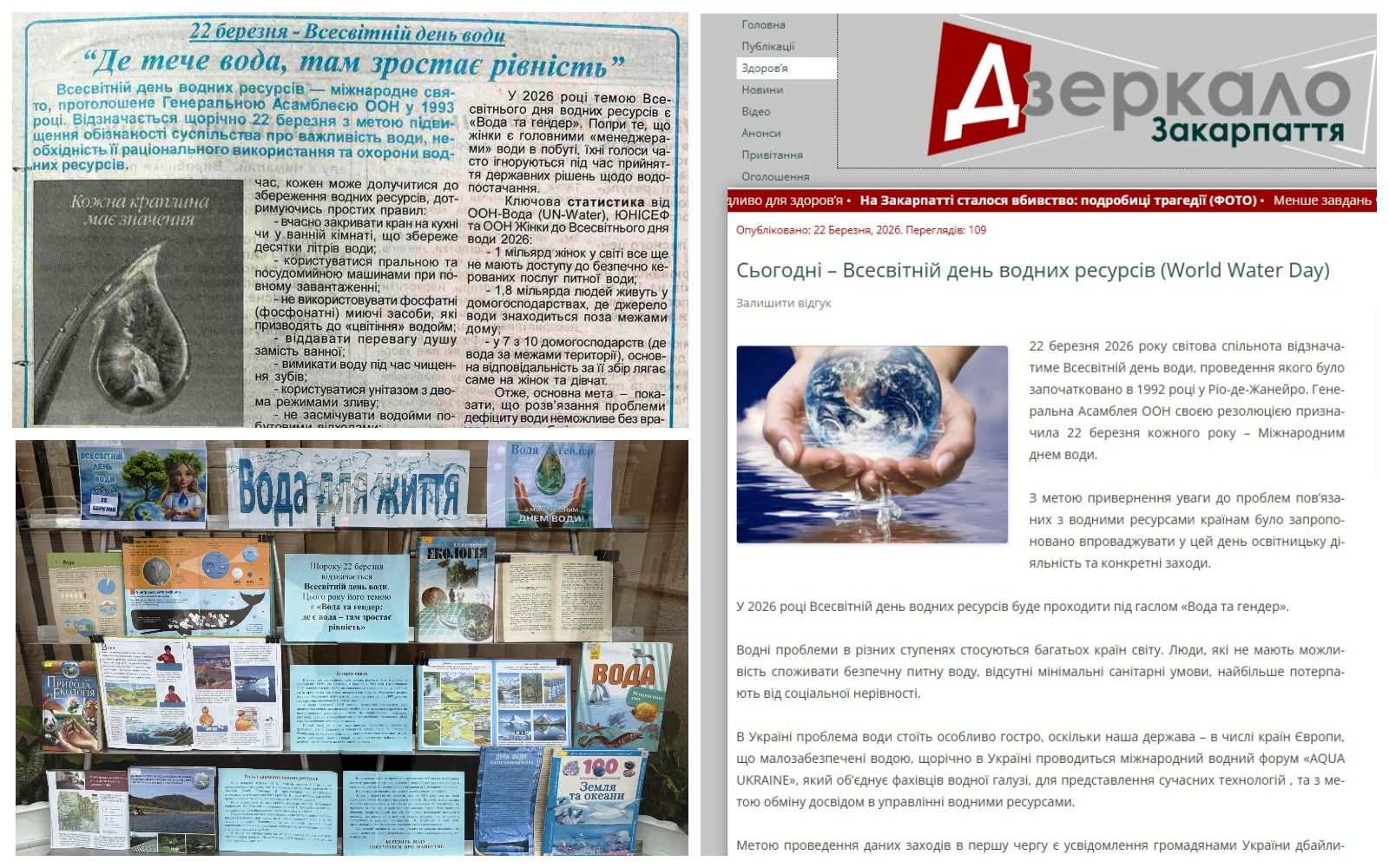 Працівники водного господарства долучилися до відзначення Всесвітнього дня води З нагоди Всесвітнього дня води водогосподарники Закарпаття провели низку заходів, спрямованих на привернення уваги до збереження водних ресурсів та формування екологічної свідомості. Протягом тижня реалізовано комплекс природоохоронних, просвітницьких та інформаційних ініціатив, що сприяли підвищенню обізнаності громадськості про значення води в житті та необхідність дбайливого ставлення до неї. Проведені заходи об’єднали громади навколо спільної мети – збереження та відтворення водних ресурсів краю. Працівниками міжрайонних управлінь водного господарства області проведено низку освітніх заходів для дітей та молоді: У дошкільному навчальному закладі №23 «Промінці» м. Мукачево відбулося пізнавальне заняття для дітей молодшої групи на тему «Для чого потрібна вода». 20 – 21 березня фахівці міжрайонних управлінь взяли участь у науково-просвітницькому заході «AquaFest», що відбувся у містах Мукачево та Ужгород. Захід був спрямований на популяризацію знань про водні ресурси, їх очищення та збереження, поєднав освітні, наукові і практичні складові. Учасники долучилися до інтерактивних локацій і практичних досліджень, зокрема експериментів з водою, вивчення процесів водоочищення, аналізу якості води та екологічних активностей у межах STEM-напряму. У Ставненському ліцеї Ужгородського району проведено урок на тему «Вода та гендер». У Виноградівській громаді організовано тематичні заняття для дітей у дошкільних закладах «Гармонія» та «Назарет». У Косівсько-Полянській бібліотеці-філії №3, присілок Березів, проведено інформаційну годину для відвідувачів за участі бібліотекаря, педагогів та фахівця управління. В Організаційно-методичному центрі культури і мистецтва Тячівської міської ради проведено інформаційно-просвітницьку лекцію на тему: «Вода та гендер» із демонстрацією навчальних матеріалів для учнів загальноосвітніх шкіл м. Тячів. У рамках проведення природоохоронних заходів працівники міжрайонних управлінь водного господарства здійснили комплекс робіт з впорядкування прибережних захисних смуг водних об’єктів. Зокрема, працівниками Іршавської дільниці Берегівського МУВГ спільно з представниками Довжанської територіальної громади провели екологічну акцію з розчистки та благоустрою природного джерела в урочищі «Підгорбом». Працівники Берегівської дільниці виконали очищення від побутового сміття прибережних захисних смуг річки Боржава в селах Боржава та Вари, а також берегів каналу Верхньо-Сернянський. Окрім того, машиністами насосних установок здійснено санітарне очищення прилеглих територій водойм та аванкамер насосних станцій у селах Берегуйфалу та Батрадь. Працівниками Батарської та Сальвінської дільниць Виноградівського МУВГ проведено прибирання сміття у заплаві річки Тиса вздовж лівобережної дамби в районі населених пунктів Теково–Гетиня, а також очищено прибережну захисну смугу річки Тиса поблизу автомобільного мосту Виноградів–Теково. Тячівським МУВГ організовано роботи з відновлення джерел питної води на територіях Ясінянської, Буштинської та Тячівської територіальних громад, де здійснено очищення джерел від намулу, сухостою та впорядковано прилеглі території. Також проведено очищення прибе