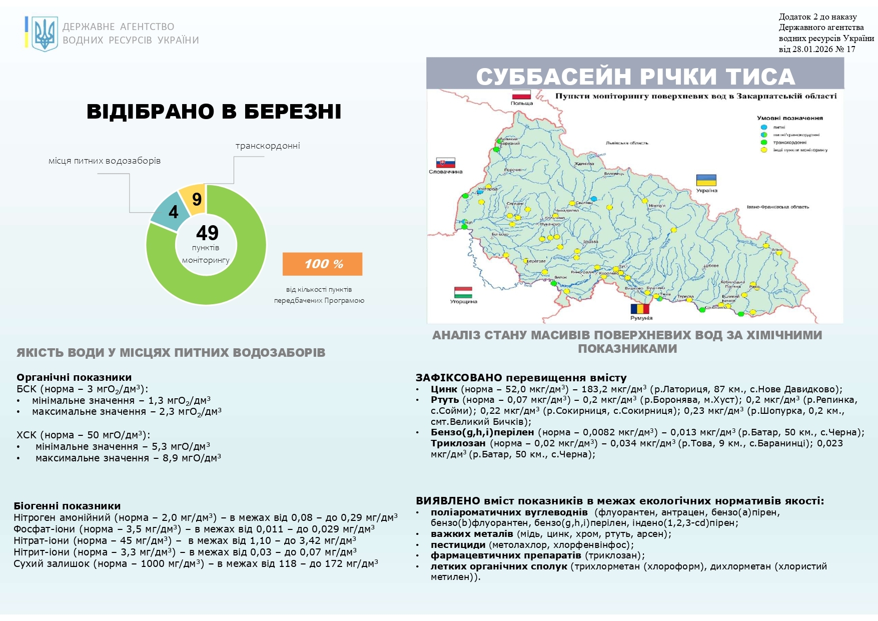 Аналітичний огляд якісного стану масивів поверхневих вод суббасейну річки Тиса за березень 2026 року Лабораторія моніторингу вод Басейнового управління водних ресурсів річки Тиса продовжує виконання моніторингу поверхневих вод у суббасейні річки Тиса. В березні програма державного моніторингу вод виконана на 100%. Інформація про результати досліджень та якісний стан поверхневих вод суббасейну річки Тиса наведена у інфографіці. Лабораторія моніторингу вод БУВР Тиси